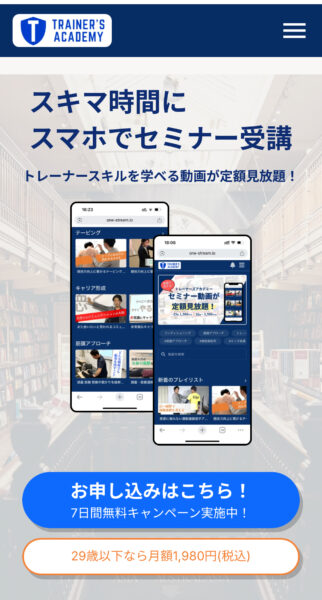トレーナーズアカデミーの「定額動画見放題プラン」なら、月額1,980円〜2,980円で実践型セミナー動画が見放題!
